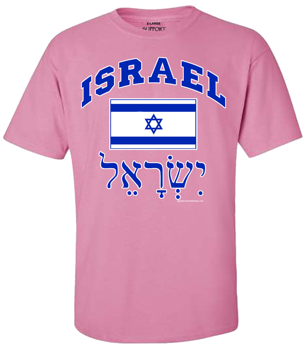 This great design is going to turn heads. It features a bold arched word: Israel at the top and an Israel Flag below it. Below that is the work Israel in Hebrew. A striking bold and beautiful design you will be proud to wear.