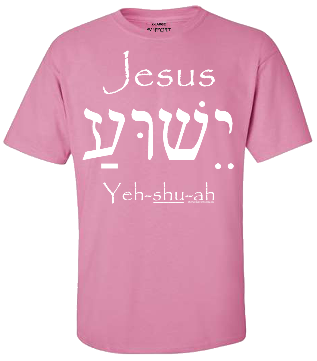 This t-shirt has Jesus in both English and in Hebrew along with the phonetic pronunciation below the two in a creative design.