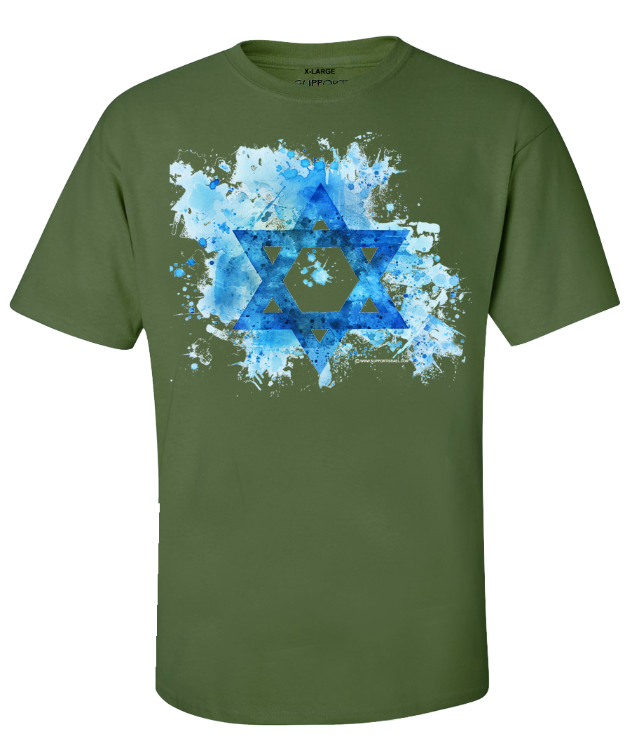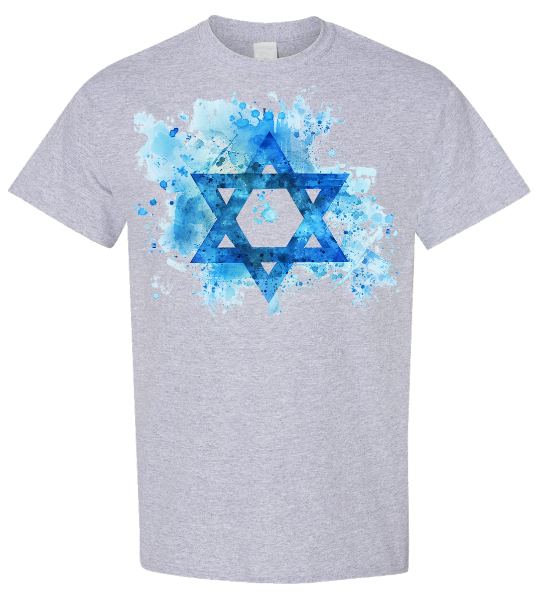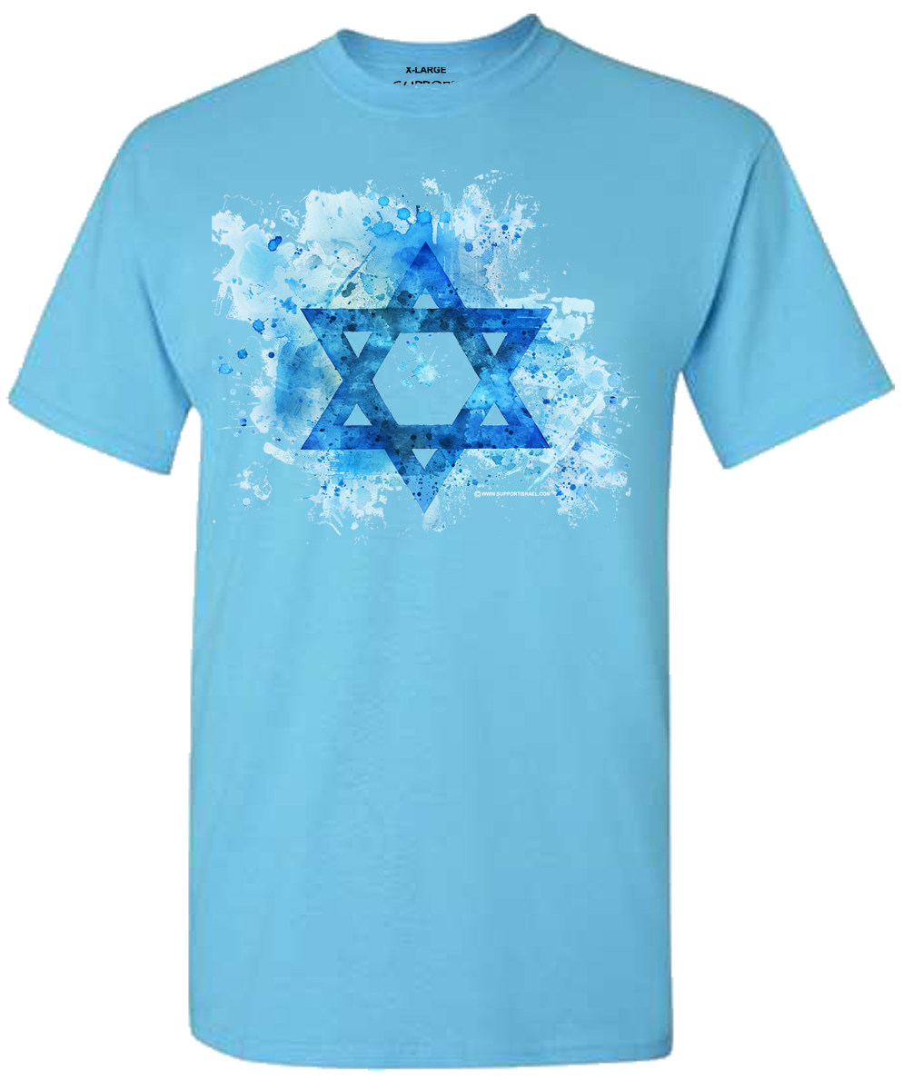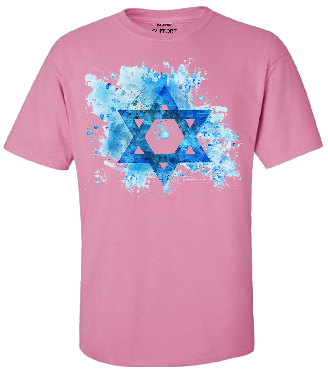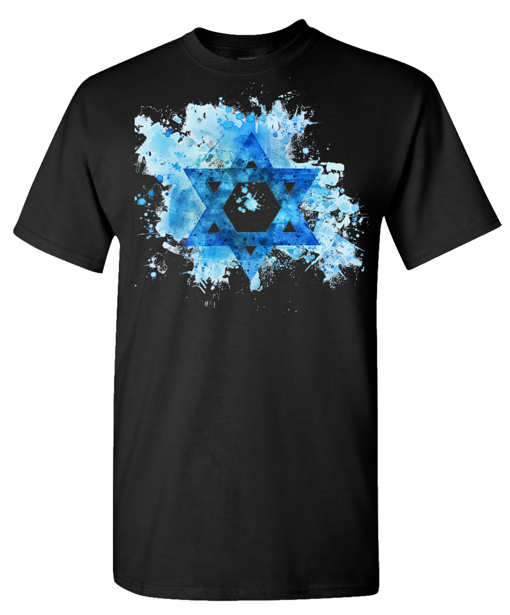 A Star of David amid a creative splash of color makes this t-shirt stand out in a crowd. If you want to be noticed this t-shirt has subtle class.