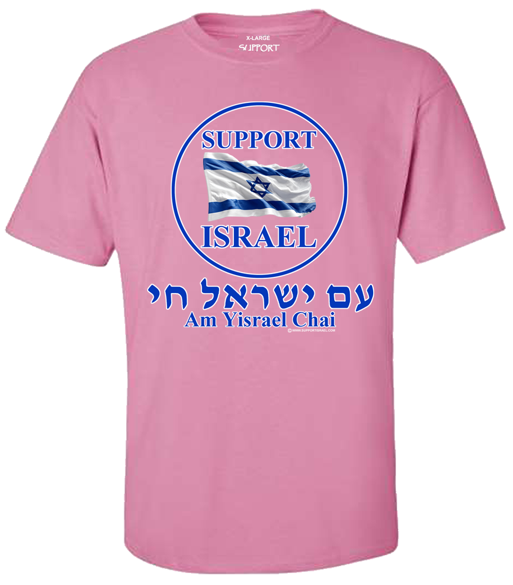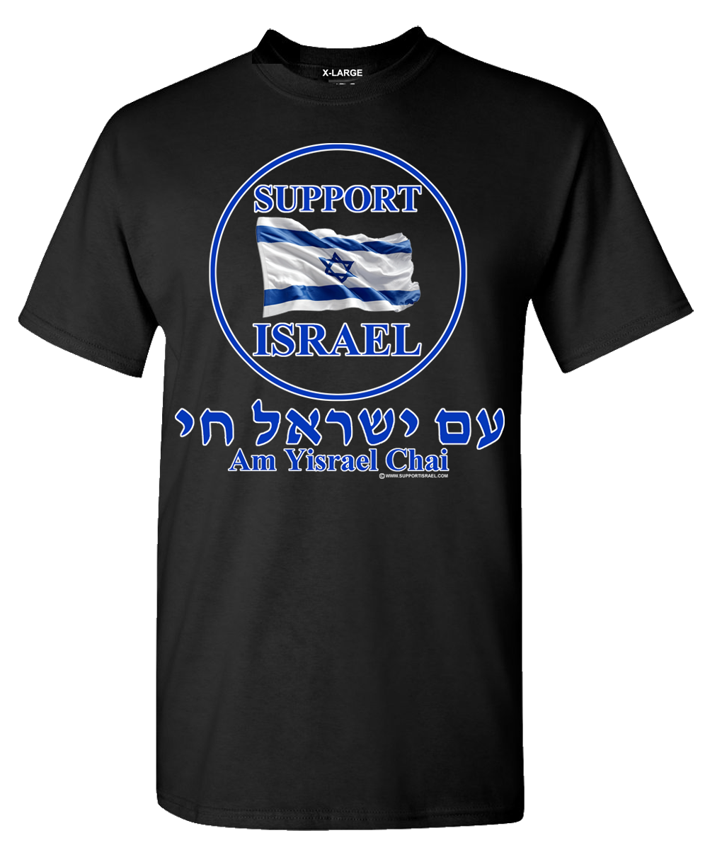 Support Israel Flag Am Yisrael T-Shirt. This T-Shirt has a great message: Both Support Israel and Am Yisrael Chai (the people/nation of Israel Live). A great combination message and a T-Shirt you are sure to be proud to wear. It also makes a great conversation starter!