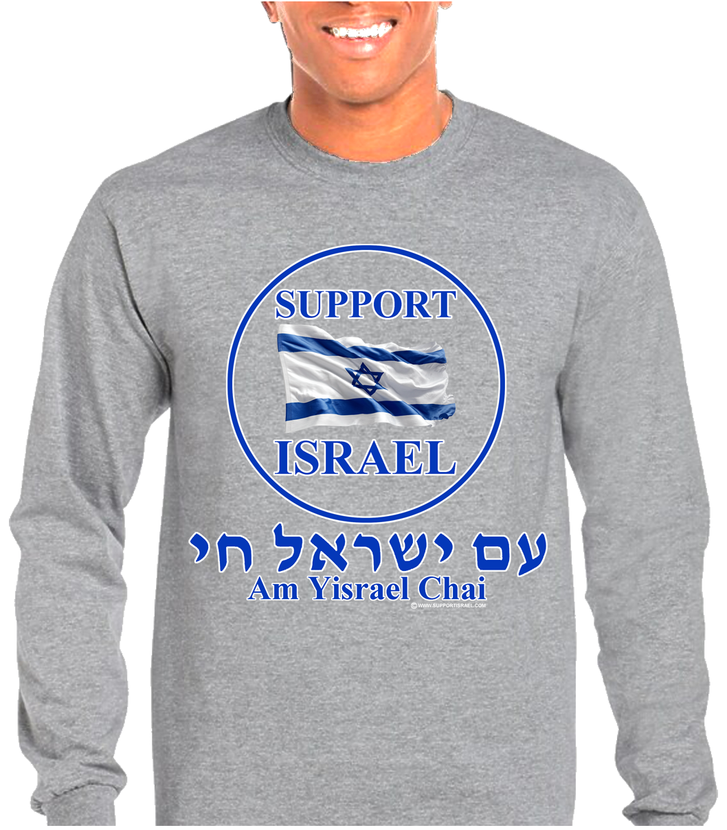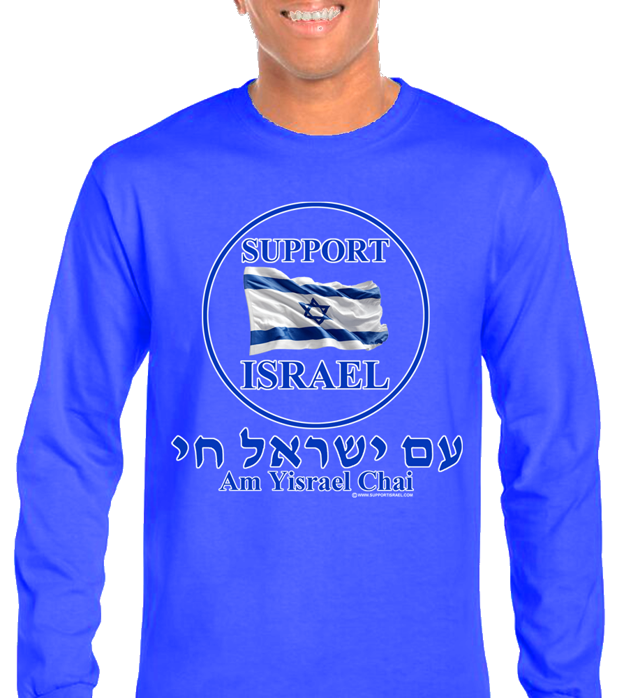 Support Israel Flag and Am Yisrael Chai Long Sleeve T-Shirt. This Long Sleeve T-Shirt has a great message: Both Support Israel and Am Yisrael Chai (The people/nation of Israel Live). A great combination message and a Long Sleeve T-Shirt you are sure to be proud to wear. It also makes a great conversation starter.